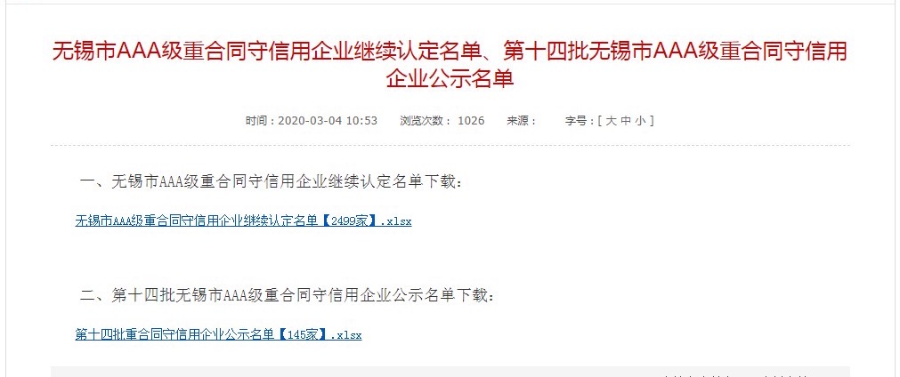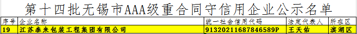 為鼓勵(lì)企業(yè)增強(qiáng)信用責(zé)任意識(shí),弘揚(yáng)誠(chéng)信守約的社會(huì)風(fēng)尚,經(jīng)市重合同守信用企業(yè)認(rèn)定委員會(huì)評(píng)審,市政府決定,命名江蘇泰來(lái)包裝工程集團(tuán)有限公司等145家企業(yè)為第十四批“無(wú)錫市AAA級(jí)重合同守信用企業(yè)”。